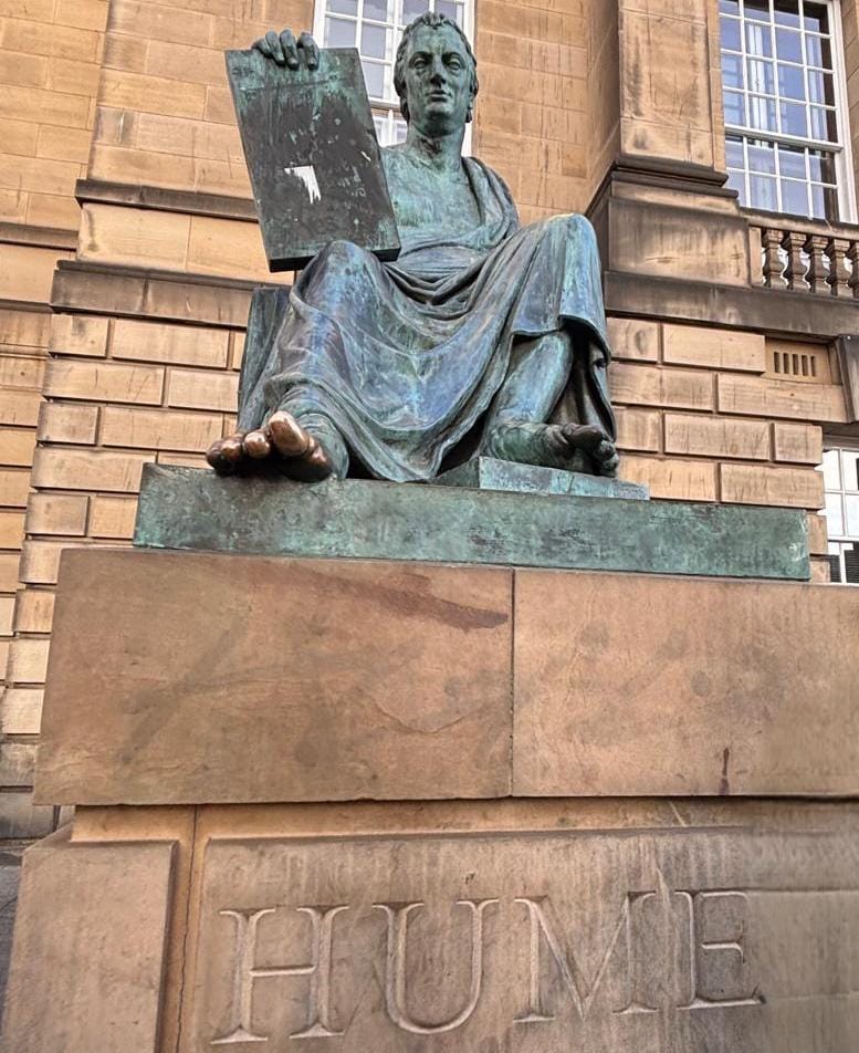 Mientras caminaba por la calle principal de Edimburgo, la famosa Royal Mile, me encontré con una escena que parecía sacada de una postal escocesa: un hombre tocando la gaita, vestido con su tradicional kilt (esa falda de cuadros que tanto identifica a Escocia), y a su lado, una estatua que llamó mi atención. Al acercarme, leí la placa y me sorprendí al descubrir que se trataba de nada más y nada menos que David Hume, el famosísimo filósofo escocés. Pero lo que más me llamó la atención fue ver a varias personas estirarse para tocar el dedo gordo del pie derecho de Hume. ¿Qué estaba pasando aquí?