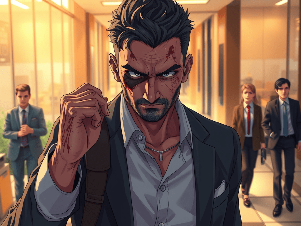 Llegó a la puerta del trabajo y antes de entrar se alisó el cabello, enderezó la postura, tomó aire y entró como el vencedor que debía ser. En la oficina todo el mundo lo miraba, algunos con sorpresa, otros con sorna y morbo, sólo algunos, los más cercanos, se atrevieron a preguntar por su deplorable estado, por los raspones y moretones en su rostro y por el costado derecho del dorso que constantemente se tocaba con la mano izquierda.
