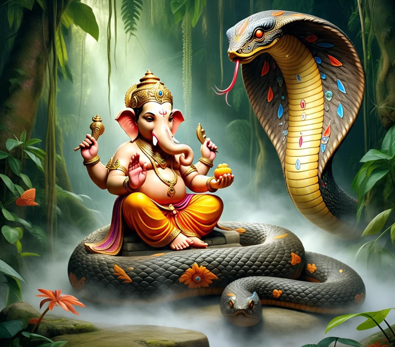 Un murmullo de sorpresa recorrió la asamblea. Nunca antes un iniciado había rechazado el cordón tradicional. De lejos, Siva observaba con interés, mientras Parvati miraba a su hijo con una mezcla de curiosidad y orgullo por su independencia. Ganesh cerró sus ojos y emitió un suave canto. De las profundidades de la tierra emergió una magnífica serpiente de escamas brillantes como joyas deslizándose hasta los pies de Ganapati. “Esta serpiente,” explicó, “representa el conocimiento eterno que se renueva una y otra vez, como la serpiente que muda su piel pero mantiene su esencia. Ella será mi yajnopavita, mi conexión viviente con la sabiduría eterna.” Con movimientos fluidos, Ganesh tomó a la serpiente con ambas manos y la colocó cruzada sobre su pecho, de izquierda a derecha, tal como se lleva el cordón sagrado tradicional. La sierpe, entendió pronto su papel sagrado y se mantuvo inmóvil en esta posición, sobre el pecho del Señor de los Escritores. Brihaspati, sorprendido al inicio, pronto comprendió la sabia elección de Ganesh. “En verdad,” exclamó, “no hay símbolo más adecuado para quien está destinado a ser el señor de la sabiduría y el removedor de obstáculos. La serpiente representa la energía kundalini, la fuerza vital que, cuando se despierta, lleva al conocimiento supremo.” Siva sonrió con aprobación y dijo: “Mi hijo eligió con sabiduría”, se volvió y declaró con una voz capaz de llegar a todo ser en el universo: “Que todos recuerden que el verdadero conocimiento no está en los símbolos externos sino en la comprensión profunda y trascendental a todas las formas”.