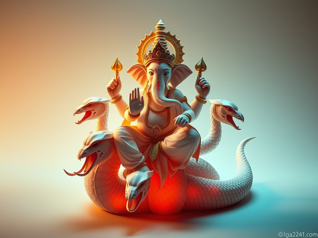 En algunas tradiciones de la India, existe una conexión entre El Señor de los Escritores y Shesha, la serpiente cósmica de mil cabezas, quien da asiento a la suprema personalidad divina. Aquí, Ganapati, en su encarnación como Vighnaraja (el rey de los obstáculos), tiene una asociación especial con Shesha: se dice que ésta le sirve y le proporciona un asiento o trono en algunas representaciones iconográficas. Tal conexión es significativa porque esta sierpe representa el infinito y los ciclos eternos del tiempo en la cosmología hindú. Su asociación sugiere que Ganesh controla el tiempo y los ciclos cósmicos, lo cual refuerza su papel como señor de los comienzos y los finales.