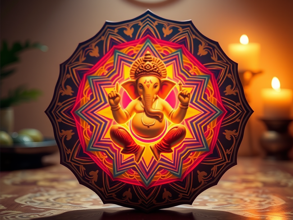 La adoración del Ganesha Yantra, conocida como Yantra Puja, implica rituales específicos de purificación y meditación. Se coloca el Yantra orientado al Este o al Norte, se purifica con agua o leche y se unge con pasta de sándalo o bermellón. La meditación consiste en fijar la vista en el Bindu central mientras se visualiza la forma de Ganesh, integrando la geometría con el sonido sagrado. El uso del Yantra es inseparable del mantra “Om Gam Ganapataye Namah”. En el culto avanzado, se recita el Ganapati Atharvashirsha, el cual identifica a Ganesh con el alfabeto y el conocimiento supremo. Aunque se usa diario, su poder se considera máximo durante el Ganesh Chaturthi, cuando se instalan nuevos Yantras para bendecir el hogar y los instrumentos de trabajo, como plumas y herramientas de escritura.