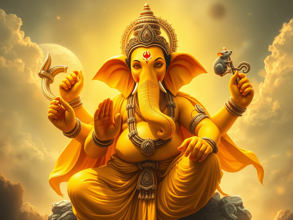 Me encanta encontrarme con serindipias. Y esta lo es: ya sea por mi edad o por moda o porque me gusta, desde hace algunos años procuro consumir y guisar con cúrcuma. Así que cuando me encontré con Haridra Ganesh me pareció significativo: serendípico, pues ésta es una advocación conocida como el “Ganesha de cúrcuma”… Una de las treinta y dos formas de Ganapati descritas en el Mudgala Purana. Su origen está ligado a la tradición tántrica y a la diosa Bagalamukhi (también llamada Pitambara Devi, la diosa de color amarillo). Según los relatos puránicos, esta forma de Ganesh fue invocada para neutralizar las fuerzas negativas de los demonios que utilizaban artes oscuras y yantras maléficos. La historia narra cómo la Diosa Madre solicitó a Haridra Ganapati que destruyera los yantras de los asuras, eliminando así sus poderes sobrenaturales. A diferencia de otras formas que luchan con armas físicas, Haridra Ganesh vence mediante la estabilización y el control de la mente del oponente, “congelando” sus intenciones hostiles (Stambhana). Su iconografía es vibrante y específica, centrada en el color amarillo de la cúrcuma: Se le representa con una complexión de color amarillo dorado brillante, similar a la pasta de cúrcuma. Viste ropajes amarillos y a menudo se dice que su propia esencia está hecha de raíces de cúrcuma. Posee cuatro brazos. En sus manos porta el lazo para refrenar los sentidos, el aguijón para dirigir el intelecto, un dulce que representa la recompensa del conocimiento, y su propio colmillo roto, símbolo de sacrificio y herramienta de escritura. Su montura es Mooshika (ratón), que simboliza los deseos erráticos y la astucia que deben ser canalizados hacia un propósito superior. A menudo se le representa con un tercer ojo, indicando la visión espiritual y la percepción más allá de lo material.